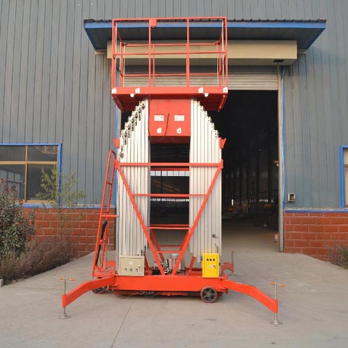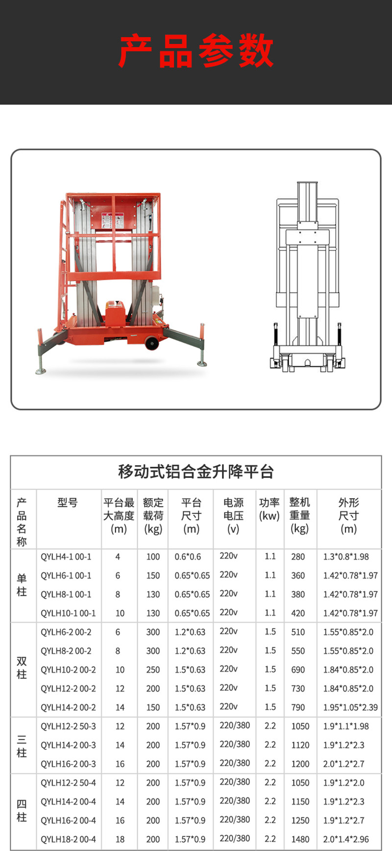 双立柱铝合金升降机:全新设计的新一代产品,整体采用高强度铝型材精制而成由于型材强度高,使升降台的偏转与摆动极小。采用双桅柱式结构,载重量大,平台面积大,稳定性好,运转灵活,推行方便。 多柱式