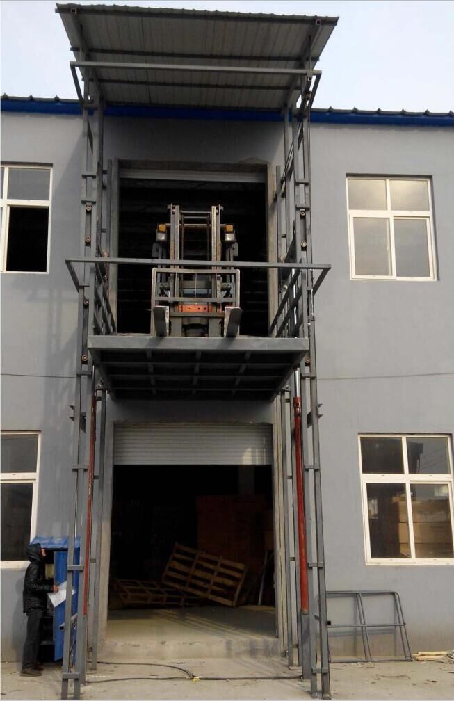 双缸双臂(室外)类货梯液压货梯适用于各类室外复杂环境,各 楼层和升降台工作台面均可设置操作按钮,实现多点控制。具有多种形式(单柱、双柱、四柱),本产品为双缸双臂式,动作平稳、操作简单可靠,液压、电器多种货物传输经济、轻松。(具体承载力及升高层数、尺寸可根据用户要求设计制作)