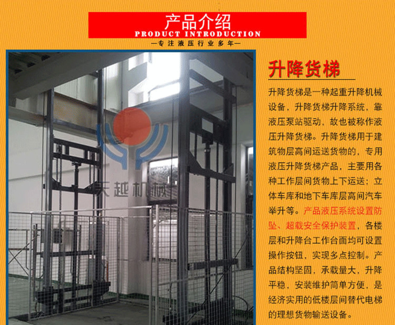 导轨式升降机原理很简单,其独特的车架结构,导轨车间的货运电梯具有简单、稳定的功能。导轨式升降货梯结构由导向轨、升降架、吊梁、油缸、链条、钢丝绳和升降平台表面组成。提升机的表面沿特定的导轨运行,这些轨道是由实心槽钢或弯管制成,并且稳定和安全。总体框架简单而直接,并酌情增加了围栏。提升机链条为双链,其中之一是轴承承链的双重保护;同步钢丝绳断链保护和平衡功能。货物和它自身的重量都由地面通过油缸运输,很安全。