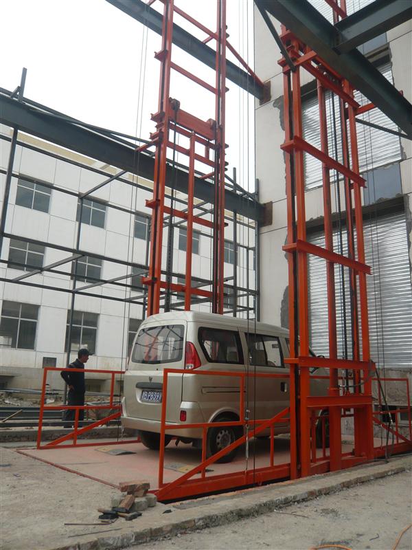 导轨式升降货梯,主要用于楼层间高空货物运输。载重1-100吨,升高高度1-25米.室内、室外均可安装,导轨式货梯,提升高度高,采用旁置油缸,运行平稳、噪音低、维修方便、使用寿命较长,停电时,可使用手动应急下降,安全、方便、快捷、实用,地坑深度一般为15cm-30cm,顶层高度不受限制,可根据现场环境定做用,适合2-3层钢结构厂房使用。