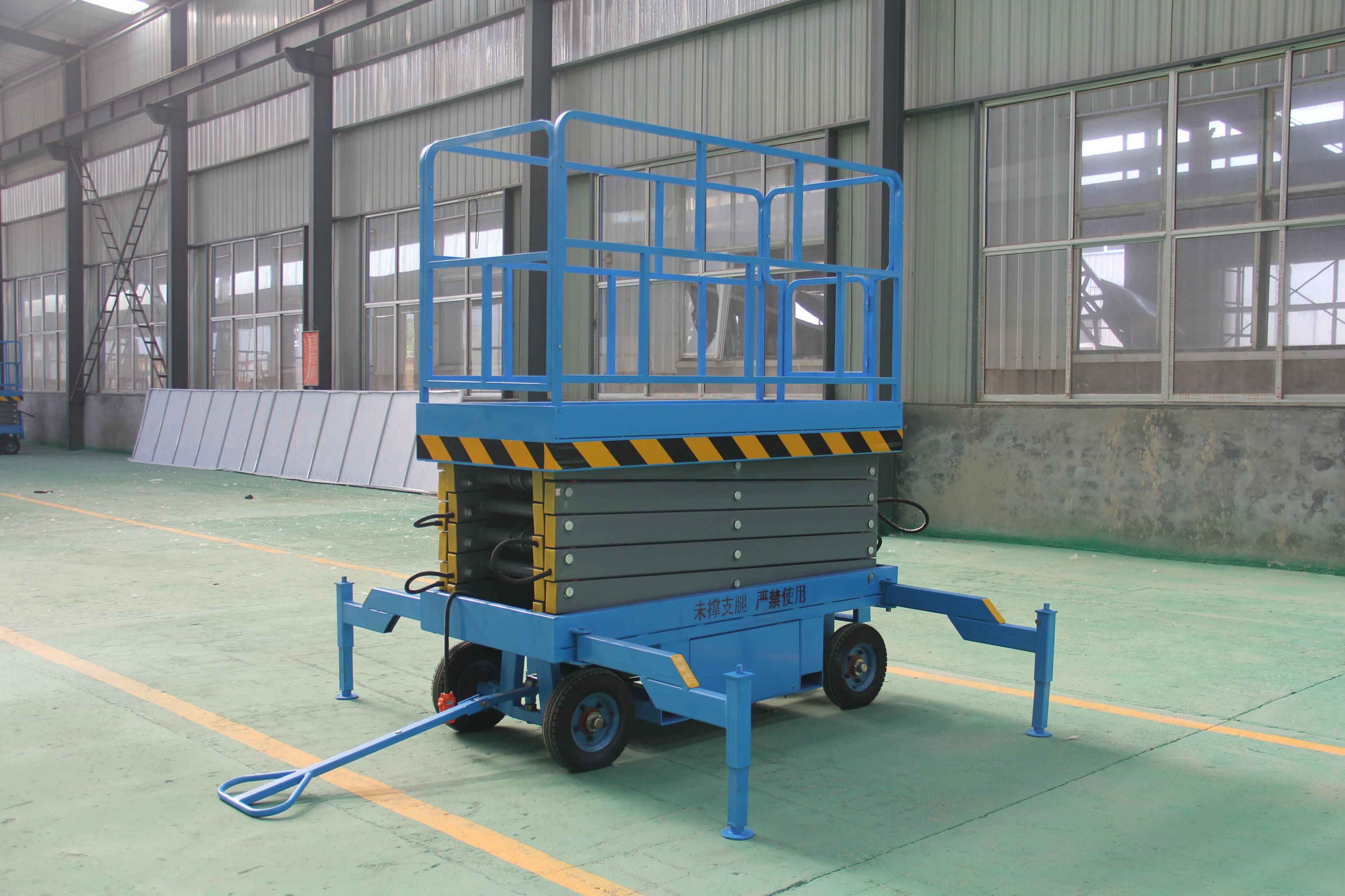 5、没有载人保护的升降台严禁载人。载人用的升降台都设有栏杆和防裂阀。防裂阀可防止油管破裂导致工作台失控下降的事故。