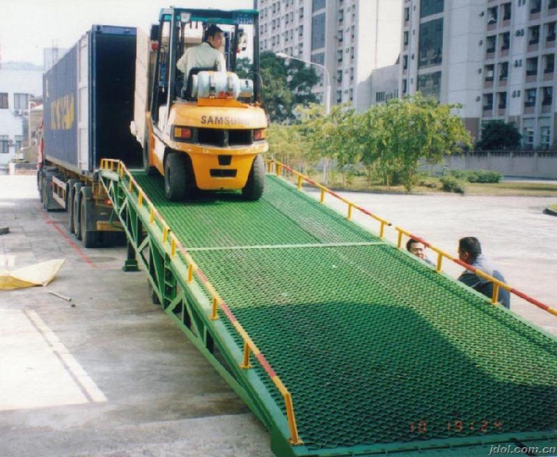 移动式登车桥一端与货台等高,另一端在车厢后缘上,并能根据不同的车型及装车过程中车厢的变化,自动调整高度,可根据用户的不同需要在外形尺寸、承受载荷等方面作特殊设计,登车桥可广泛应用于邮政、粮食、车站码头、海洋运输等行业。