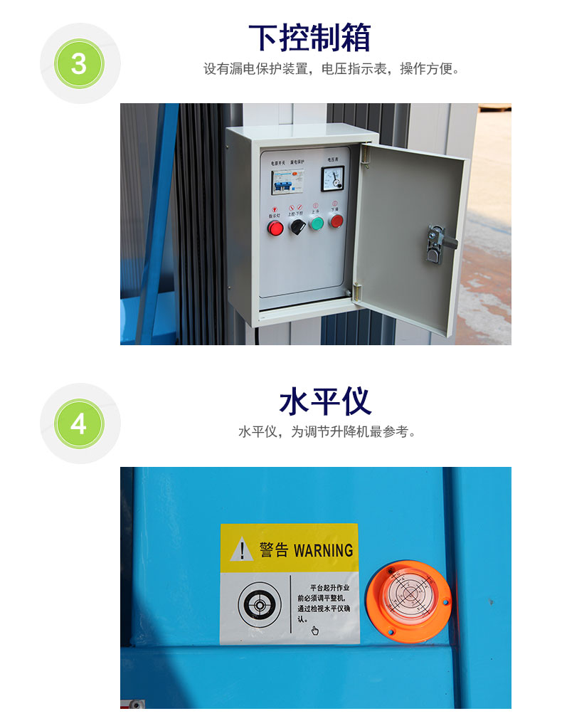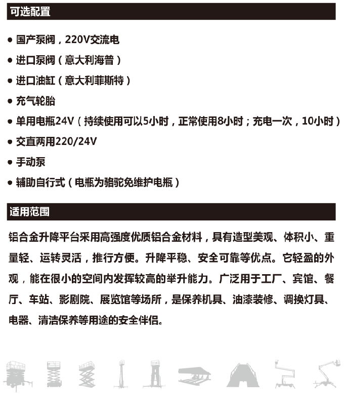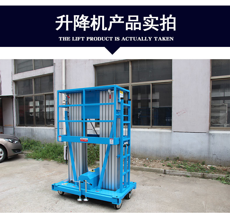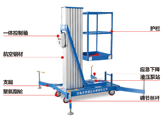 4米铝合金升降机升降动力分为220V、 380V,或电瓶动力源,特殊环境也可采用防爆泵站及防爆电器。升高4——10米,载重100-150公斤。主体采用高强度优质铝合金材料,具有造型美观、体积小、重量轻、升降平稳、安全可靠等优点。