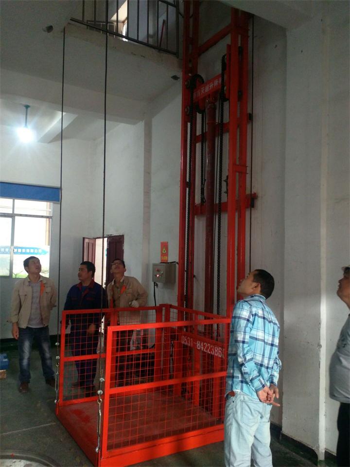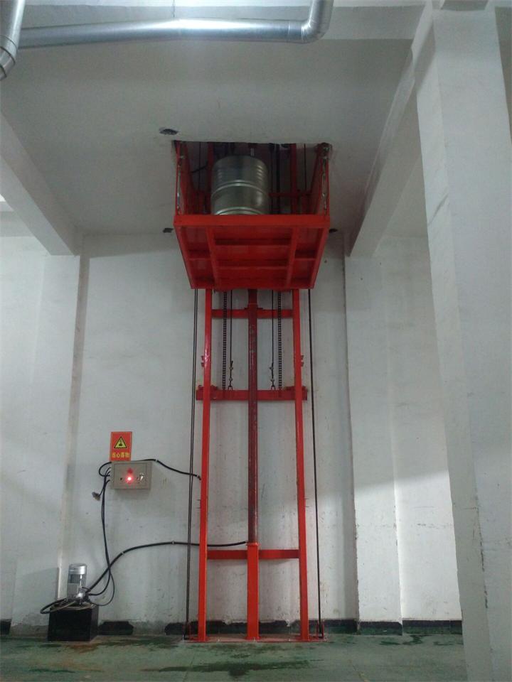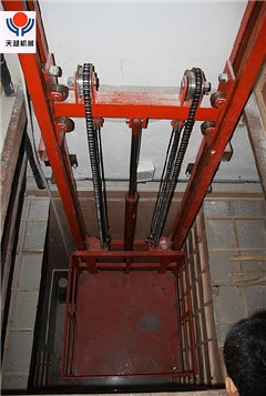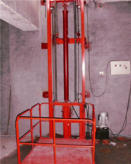 单臂导轨链条式货梯是一种起重升降机械设备,麻雀虽小,五脏俱全。设备靠液压泵站驱动,用于建筑物层高间运送货物的,主要用各种工作层间的货物上下运送;各楼层和升降台工作台面均可设置操作按钮,实现多点控制。产品结构坚固,承载量小,一般在一吨以下,升降平稳,安装维护简单方便,是经济实用的低楼层间替代电梯的理想货物输送设备。