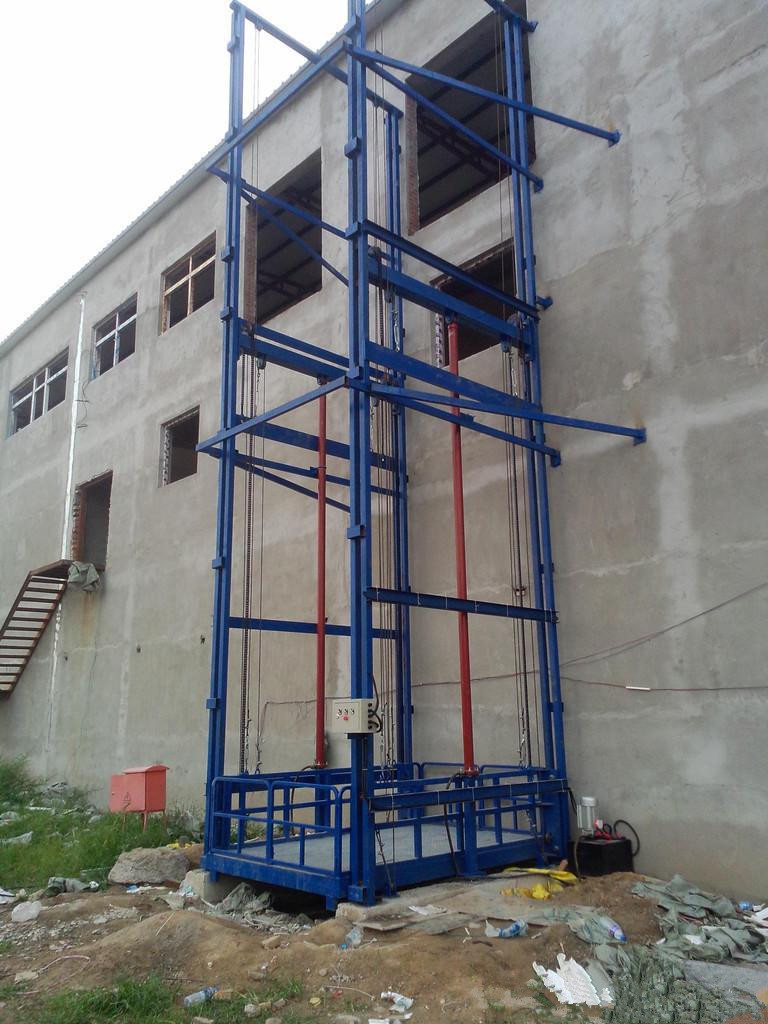 双缸双臂(室外)类货梯液压货梯适用于各类室外复杂环境,各 楼层和升降台工作台面均可设置操作按钮,实现多点控制。具有多种形式(单柱、双柱、四柱),本产品为双缸双臂式,动作平稳、操作简单可靠,液压、电器多种货物传输经济、轻松。(具体承载力及升高层数、尺寸可根据用户要求设计制作)
