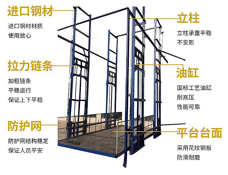 导轨式升降机原理很简单,其独特的车架结构,导轨车间的货运电梯具有简单、稳定的功能。导轨式升降货梯结构由导向轨、升降架、吊梁、油缸、链条、钢丝绳和升降平台表面组成。提升机的表面沿特定的导轨运行,这些轨道是由实心槽钢或弯管制成,并且稳定和安全。总体框架简单而直接,并酌情增加了围栏。提升机链条为双链,其中之一是轴承承链的双重保护;同步钢丝绳断链保护和平衡功能。货物和它自身的重量都由地面通过油缸运输,很安全。