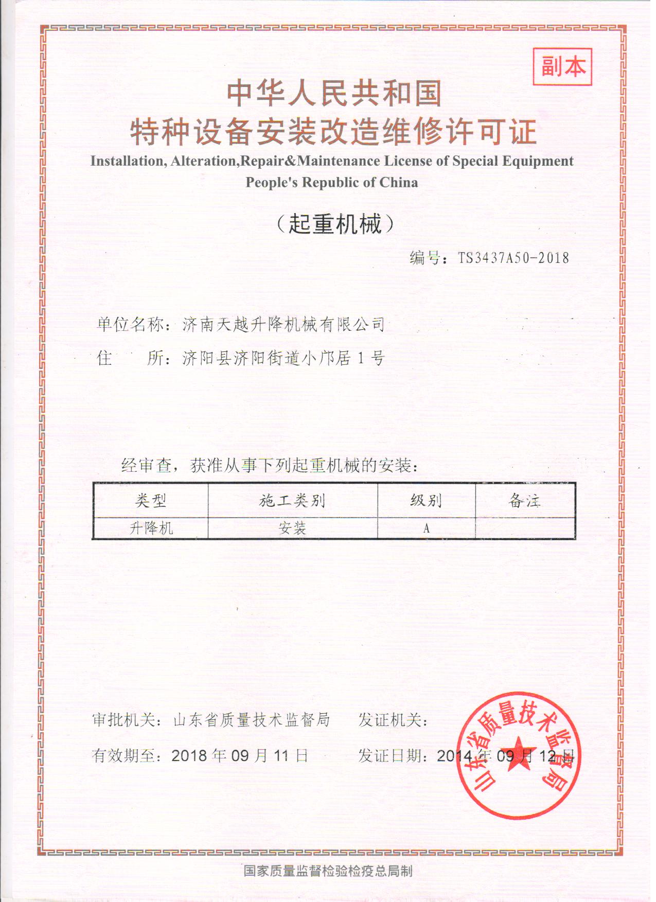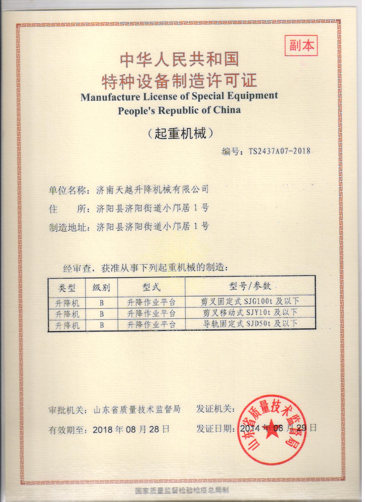 货梯生产资格证 济南天越升降机械有限公司位于山东省济南市济阳济北开发区,占地面积共约16700平方米,生产厂区约10200平方米,办公区约6500平方米。现有职工206人,各种工程技术人员30人。(高级工程师10人,工程师18人,经济师2人)。设有技术部、生产部、质检部、销售部、售后服务部、财务部、经理室机综合办公室等8部、室。本企业是高空作业升降机和液压升降设备的专业生产厂家,现生产的产品有移动式、固定式、链条轨道式、铝合金式、车载式、曲臂式及物流登车桥装卸平台等八大系列26个品种。生产的所有产品的各项性能和技术指标均达到《中华人民共和国机械行业标准》JB/T9229.1~9229.-1999规定的要求。并获得了国家质检总局颁发的《特种设备制造许可证》和《特种设备安装改造许可证》。公司拥有健全的管理团队与强大的销售网络,先进的生产工艺。精良的生产设备、精密的检测仪器、雄厚的技术力量使公司生产的产品性能更优越,质量更稳定,所有系列的产品畅销全国各地,深受广大用户的好评。