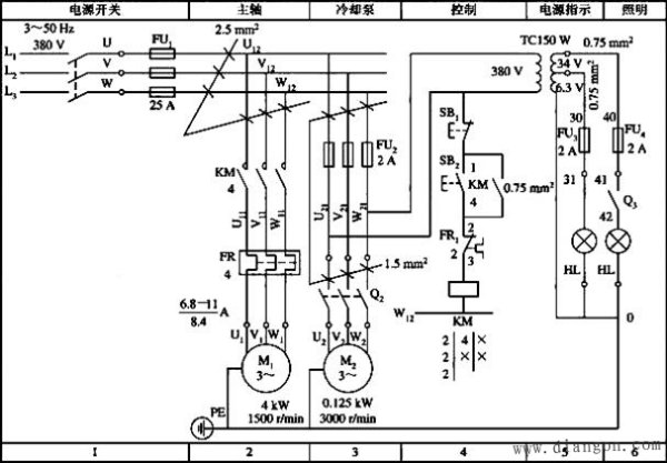 (3)从电源到电动机的电路,通过的电流较大,称为主电路,用粗线条绘制; 辅助电路(包括控制电路、照明电路和信号电路)的电流小,用细线条绘制。