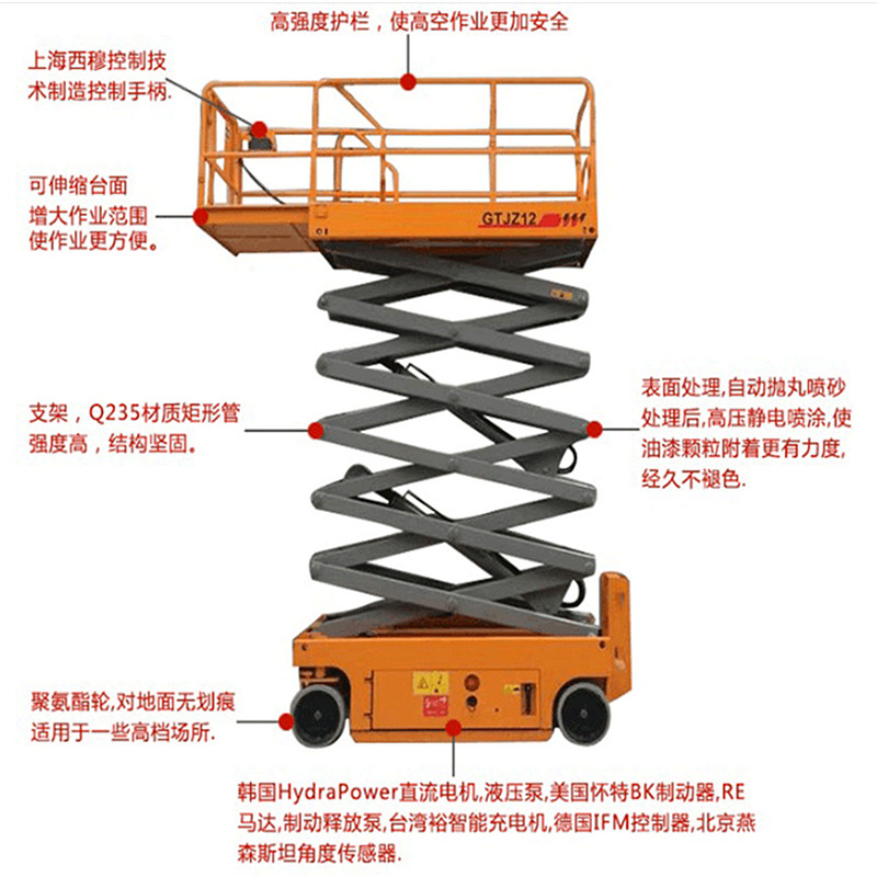 自由转弯装置。紧急下降系统。工作高度从4米至22米、高档的配置、大功率的动力、高技能的操作系统。